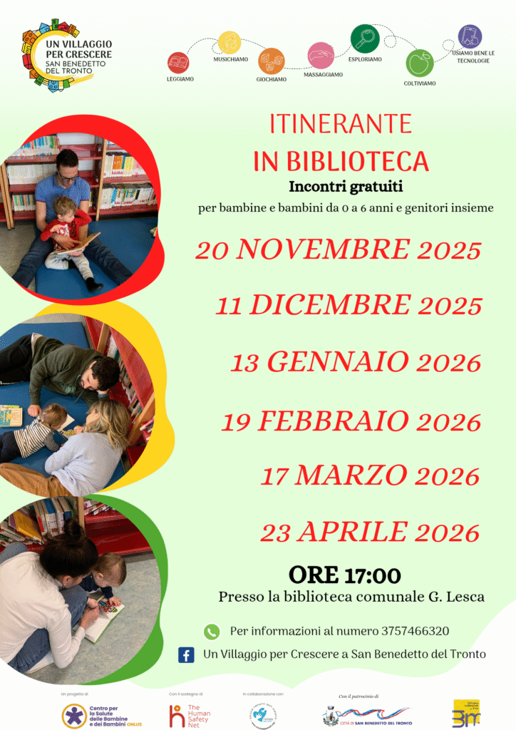 Inoltre, grazie alla collaborazione con il Servizio Politiche Sociali, da novembre 2025 ad aprile 2026 la biblioteca ospiterà gli incontri itineranti, gratuiti e infrasettimanali di “Un villaggio per Crescere – San Benedetto del Tronto”. Si tratta di una realtà ormai profondamente radicata nel territorio all’interno del Centro Famiglie di via Manzoni che accoglie svariati servizi per l’infanzia e che promuove interventi e iniziative a sostegno della genitorialità e della disabilità, anche attraverso l’associazionismo.