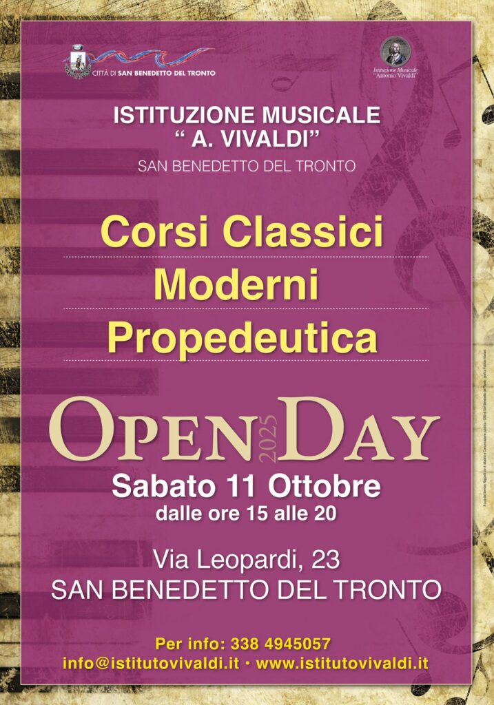 In vista dell’apertura dell’anno accademico 2025/2026, sabato 11 ottobre l’Istituzione Musicale “Antonio Vivaldi” aprirà dalle 15:00 alle 20:00 le porte della sua sede di via Leopardi (edificio dell’asilo “Merlini”) per un “open day” nel corso del quale saranno presentati spazi e corsi a tutti coloro che sono interessati ad avvicinarsi alla musica o approfondire la conoscenza degli strumenti musicali. Saranno infatti illustrati nel dettaglio le attività didattiche e l’offerta formativa.