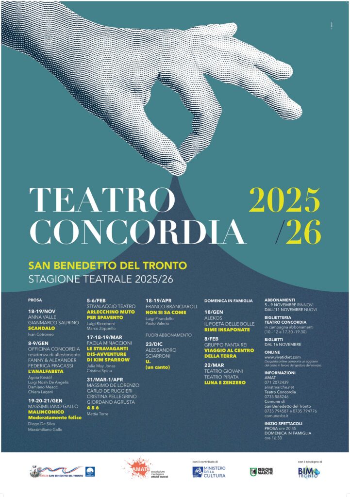 È stata presentata nella mattinata di mercoledì 15 ottobre la nuova stagione teatrale del “Concordia” di San Benedetto, realizzata dall’Associazione Marchigiana Attività Teatrali – AMAT con la collaborazione del Comune e il contributo del Ministero della Cultura, della Regione Marche e del Consorzio BIM Tronto.