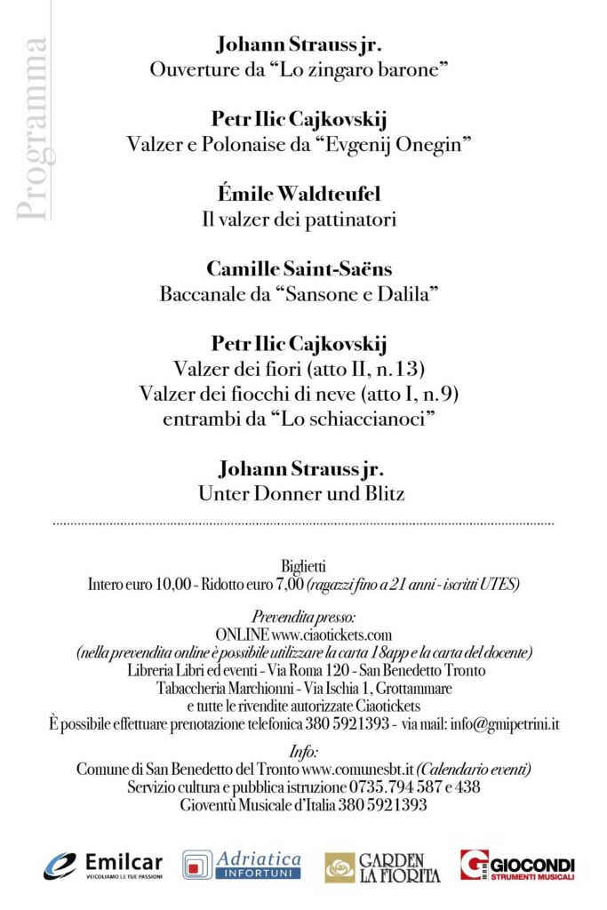 In programma l’esecuzione dei brani più belli dei tradizionali concerti di inizio e fine anno, con le opere più famose di Strauss, lo “Schiaccianoci” di Tchaikovsky con i suoi famosi “Valzer dei Fiori e dei Fiocchi” e ancora “Saint-Saens”. Per finire, bis a sorpresa fra cui la tradizionale “Marcia di Strauss” per un finale corale con la partecipazione del pubblico.